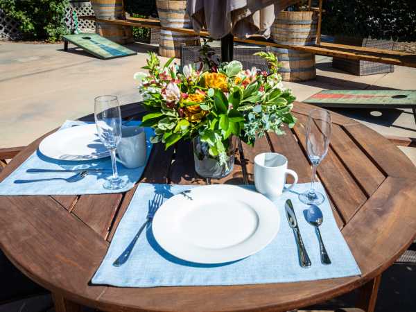 We love pets! Bring your fur family members! Please be mindful that all dogs must be on a leash when they are outside the home, including the patio area.